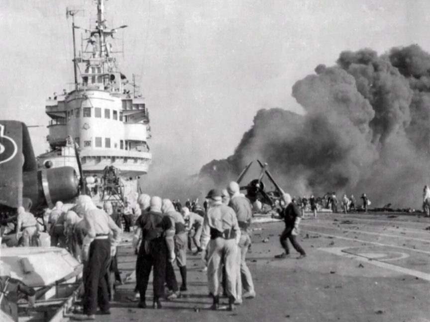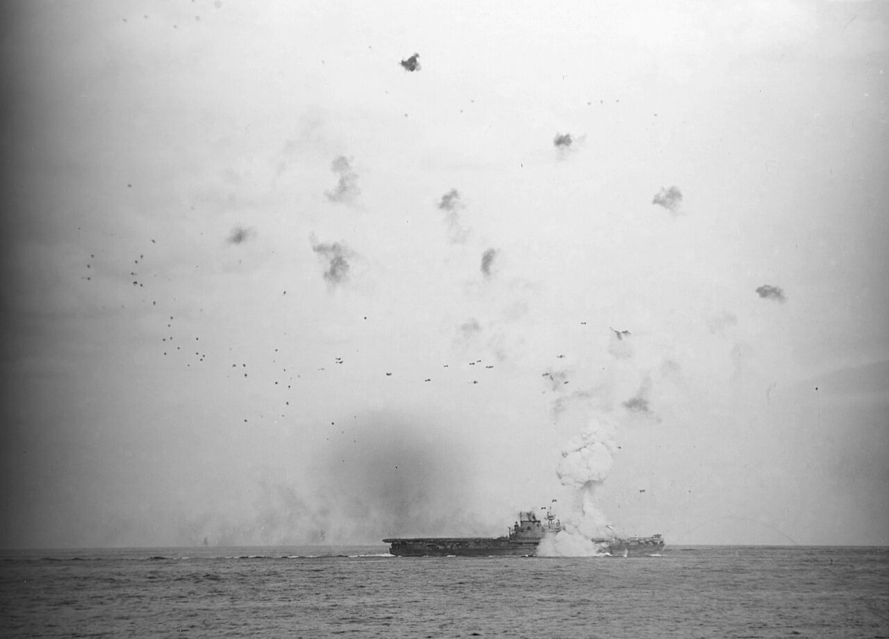 May 4, 1945 British aircraft carrier Indomitable, operating as part of the British squadron off the coast of Okinawa, was attacked by kamikaze aircraft. The flight deck was cleared and fires were extinguished in less than an hour.