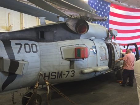 A couple of steep ladders later, we emerged into the hangar bay—and what a sight. A Seahawk helicopter on one side, an F/A-18 on the other, and sailors everywhere. It immediately brought back memories of my own time in the Navy.