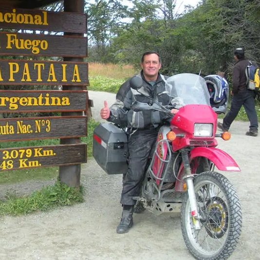 In 2008–2009, he rode from Panama to Tierra del Fuego, made a side trip to Antarctica, returned north through Brazil, replaced an engine along the way, and continued to Alaska, New York, and Florida.